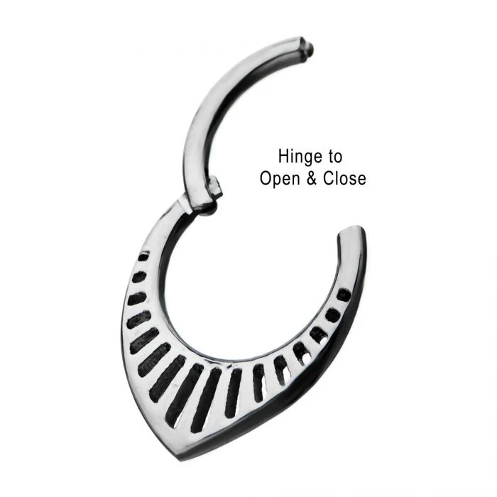 16g 5/16 Rounded Teardrop Hinged Segment Rings with Gradual Cut Out Etched Line Design. Made entirely from Surgical Steel. Can be worn in lobe, cartilage, septum & daith piercings.